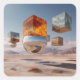 This surreal artwork captures a moment of perfect stillness where geometry, reflection, and landscape exist beyond the rules of gravity. Monumental cubes float effortlessly above a vast desert plain, their surfaces textured with fire-like minerals, clouds, stone, and sky—each face telling a different visual story. Beneath them, a polished mirror sphere reflects the endless horizon, bending reality into a smooth, dreamlike curve.