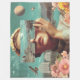 A woman wearing futuristic glasses appears in a dreamlike landscape, surrounded by flowers and architectural structures. A planet and birds add to the surreal atmosphere.