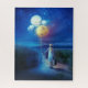 Amazing art design of a starry night sky. A little girl with golden pigtails is walking with an old suitcase in one hand and glowing balloons in the other. Each of the balloons depicts a separate planet in the solar system. This is an image showing the forward looking future this little kid has of where she is headed.