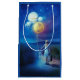 Amazing art design of a starry night sky. A little girl with golden pigtails is walking with an old suitcase in one hand and glowing balloons in the other. Each of the balloons depicts a separate planet in the solar system. This is an image showing the forward looking future this little kid has of where she is headed.