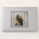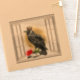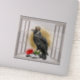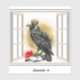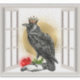 Unique vinyl sticker features The Raven King sits on a perch in an open window with a red rose at his feet.
