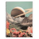 A surreal scene features Saturn hovering above a mountainous landscape with vibrant flowers in the foreground. The lush colours contrast with the celestial backdrop, creating a dreamlike atmosphere.