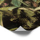 The image showcases a vibrant tropical landscape featuring lush vegetation, tall palm trees, and a serene river winding through a valley. In the background, mountains rise into a sky filled with large, golden-hued clouds. The foreground is rich with diverse plant life and colourful flowers. The overall atmosphere is peaceful and dreamlike, with a focus on natural beauty.