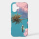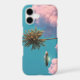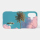 This surreal artwork captures a beautifully unexpected collision of worlds, where a lone palm tree rises from a mountain landscape beneath a pastel sky filled with towering clouds. Snow-dusted peaks stretch across the horizon, while power lines quietly anchor the scene in reality. Cutting through it all, a sleek UFO glides effortlessly through the air, adding motion, mystery, and a touch of retro sci-fi intrigue.