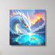 Sci fi surreal wall art. A beautiful illustration white dragon looking at a goldfish while volcanos erupt in the background.