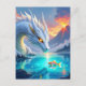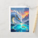 A sci fi surreal postcard to keep in touch with a friend.  A beautiful illustration white dragon looking at a goldfish while volcanos erupt in the background.