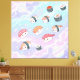 An adorable and imaginative design featuring a variety of happy, smiling sushi characters soaring through a dreamy pastel-colored sky filled with fluffy clouds and ringed planets. It's a perfect blend of Japanese cuisine cuteness and cosmic fantasy.
