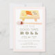 This stylish and modern " Let the good times roll" birthday party invitation features watercolored sushi on wood board with chopsticks on white background framed by a blush pink border. The reverse side features diagnol stripes in blush pink and faux gold. Change the background colour on both front and the back and personalise it for your needs.