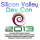 Free standing desktop sign featuring the Silicon Valley Dev Con logo, with binary at the bottom that says "Come Play With Us!"