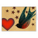 Retro style tattoo imagery of swallows and stars with a red heart.