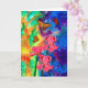 Print of my original water colour painting on a Greeting Card featuring a colourful abstract sky with two swallowtail butterflies and a monarch butterfly fluttering around pink iris flowers.