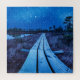 Panoramic view of bog at night with wooden path, small ponds and pine trees. Hiking trail with wooden walkway that goes across the swamp against full moon and night sky with stars