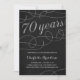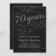 This fancy, stylish 70th birthday party invitation features elegant vintage flourishes, script calligraphy that reads "70 years," glittery faux silver foil, and a chic black background.