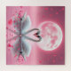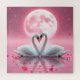 Two swans making a heart on a pink lake in front of a pink moon.