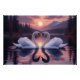 Two white swans form a perfect heart beneath the soft glow of the full moon, reflected in the calm waters at dusk. The scene conveys romance, purity, and harmony, framed by mountains and forests, creating a magical and unforgettable atmosphere.