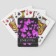 This playing cards design features a swarm of artistic butterfly representations. The wings of the butterflies feature a line pattern colored various shades of colors like magenta and purple, while the body is colored shades of aquamarine. It also features a personalized name.