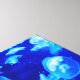 Features an incredible image of jellyfish swimming together deep under the ocean: they appear fluorescently bright in contrast to the dark blue water.