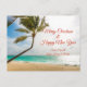 Tropical "Merry Christmas" postcard with custom red script text for greeting and signature. Shimmering turquoise sea water and beach sand are the backdrop for your custom greeting. Lines are provided on the back for addressing. Affordable holiday greeting cards to send from a warm climate.