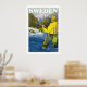 Vintage travel poster for Sweden showing a fisherman in the outdoors.