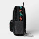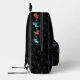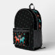 This printed has a Swedish folk dala horse design with matching folk art flowers in Sweden's flag colours of teal and red on black background. At the top are a row of matching smaller dala animals and flowers. Personalise this with your name and can make the background flower pattern on this backpack smaller or larger.