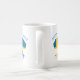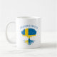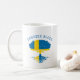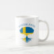 Stylish coffee mug with 2-sided graphic featuring a tree with roots silhouette with the flag of Sweden fill and "Swedish Roots" curved top text on light grey background.