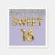 Gold sweet 16 balloons and colourful confetti on lavender purple background for Sweet 16 birthday party.