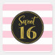 Sweet 16 birthday party favour tag stickers with in pink gold, black and white stripes pattern.