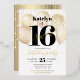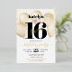 “Happy Sweet 16”. Send out this stunning, simple, festive, modern, personalised real gold foil party invitation for an event to remember. Bold, graphic, black typography and real gold foil handwritten script overlay faux gold balloons and faux gold sparkly string lights on a sophisticated, white background. Personalise the custom text with your daughter’s name as well as other party details. Great for the budding fashionista who loves modern glam and guaranteed to add stylish fun to her special party!