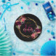 A plate for a Sweet 16th birthday party. A chic black background with a faux gold geometric frame. Decorated with dark purple and burgundy flowers, roses and boho style feathers. Templates for a name, age 16 and a date. Date of birth or the date of the party. The name is written with a hand lettered style script, pink coloured letters, age 16 in purple and the date with golden numbers.