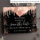 A black background decorated with rose gold, blush faux glitter drips, sparkles, and balloons. Personalise and add a date and name/age. The text: Save the Date is written with a large trendy hand lettered style script.