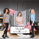 Elegant, glamourous and feminine for a girl's 16th birthday party. Classic and chic slim black and white vertical stripes. Decorated with pink flowers, peonies and roses. Templates for a name, age 16 , date of birth and the date of the anniversary. Template for your own vertical sized photo. Girly and elegant!