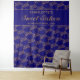 Sweet 16 birthday party backdrop in blue and gold - perfect for photobooth, welcome sign or just as a large piece of party decor to help set the theme. The design has a diagonal, step and repeat, tiled pattern of Sweet Sixteen, which is lettered in swirly calligraphy and elegant typography. The template is ready for you to add the birthday girl's name and event date.