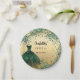 For a Sweet 16, 16th birthday party. A faux gold looking background with green confetti, a dress and green confetti. The name is written with a modern hand lettered style script. Personalise and add your name and a date.