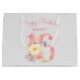 Large gift bag for 16th Birthday. This delicate and feminine design features the number 16, decorated with a bouquet of flowers and foliage. The gift bag is lettered in pretty script and classic typography with the wording "Happy Birthday Sweet" above the number 16. It has a soft colour palette of blush pink, apricot, yellow, gold and dusty blue with a lightly textured background effect in shades of white and soft grey. Please browse our store for coordinating 16th birthday invitations and party decor.