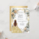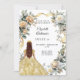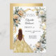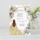 A faux gold looking background. Decorated with white and yellow florals and a golden ribbon. A girl wearing a tiara and a dress. Personalise and add a name and details.