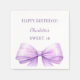 A white background color. Decorated with a large lavender colored bow. Personalize and add the name and date. Text: Happy Birthday!