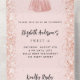 Rose gold, blush coloured background, decorated with a girl in dress, and confetti on the inside. Personalise and add a photo, names, party details, RSVP date, return address and name.