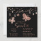 Sweet 16 Rose Gold Butterfly Chic Modern Birthday Invitations features elegant rose gold butterflies with string lights on a black background with your Sweet 16 Invitation information below. Personalise by editing the text in the text boxes. Designed for you by ©Evco Studio www.zazzle.com/store/evcostudio