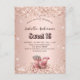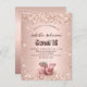 A rose gold gradient background decorated with faux sparkles, confetti and a romantic vintage carriage. Personalise and add her name, party details.