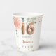 For an elegant Sweet 16, 16th birthday party. A white background. On the front and the back: Personalise and add a name and a date. Decorated watercolored rose gold and blush pink florals, eucalyptus greenery and faux glitter dust. Nr 16 is written with a balloon style font.
