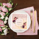 A paper napkin for a girly, femenine and glamourous Sweet 16, 16th birthday party. A chic golden and blush pink gradient background with a faux gold geometric frame. Decorated with dark purple and burgundy flowers, roses and boho style feathers. Rose gold faux glitter drips, paint drip look on the front and the back. Templates for a name and a date. The name is written with a hand lettered style script, black letters. Date and text as curved text.