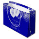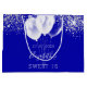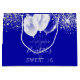 A gift bag for a girly and glamourous Sweet 16, 16th birthday. A royal blue background decorated with glitter sparkles and white balloons. Personalise and add a date, name and age. The text: The name is written in white with a modern hand lettered style script