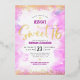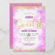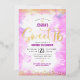 “Happy Sweet 16”. Send out this stunning, sparkly, girly, festive, modern, personalised, custom real gold foil party invitation for an event to remember. Sparkly real gold foil, tiny confetti dots and handwritten script overlay a soft pink watercolor background. Personalise the custom text with your daughter’s name as well as other party details. Great for the budding fashionista who loves modern glam and guaranteed to add stylish fun to her special party!