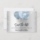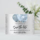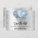 A girly and trendy Save the Date card for a Sweet 16, 16th birthday party. A faux silver looking background decorated with faux silver glitter dust and blue balloons. Personalize and add a date and name/age. The text: Save the Date is written with a large trendy hand lettered style script.