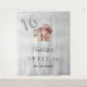 A welcome tapestry for a girly and glamourous Sweet 16, 16th birthday party. A faux silver metallic looking background decorated with faux glitter dust. Personalise and add a high quality photo, name and date. Number 16 is written with a balloon style font.