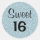 Sweet 16 round sticker with glam light blue silver glitter sparkles and bold black writing.