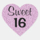 Sweet 16 heart sticker with glam lilac purple glitter sparkles and bold black writing.