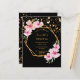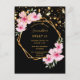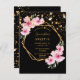 A tropical floral, under the stars Sweet 16, 16th birthday party invitation with pink hibiscus flowers, greenery and a faux gold geometric frame and golden stars. Elegant black background. Templates for a name written with a modern handlettered style script, templates for your party information. Black text. Perfect for a summer, pool or beach celebration!