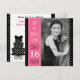A very pretty, bold girly pink and black coloured design that works well with black and white photographs of your daughter celebrating her sweet sixteenth birthday! Invite all of her girl friends to a special sweet 16 celebration with this stylish card. The design features classy chic lettering on the front with a stitched style bright pink ribbon and sweet polkadot edges that coordinate with the triple layer birthday cake with a bow on top graphic on the reverse side. It has several easy to customise text areas on the reverse side for your birthday girl's name and all sleepover or celebration party details, as well as rsvp contact information. Adjust your photo image size and cropping to suit. Sample image from dreamstime is for illustration purposes only - replace with your own photograph.