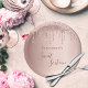 A paper plate for a girly and glamourous Sweet 16, 16th birthday party. A rose gold gradient background with faux glitter drips, paint dripping look. The text: Sweet Sixteen is written in dark rose gold with a modern hand lettered style script. Personalise and add a name.